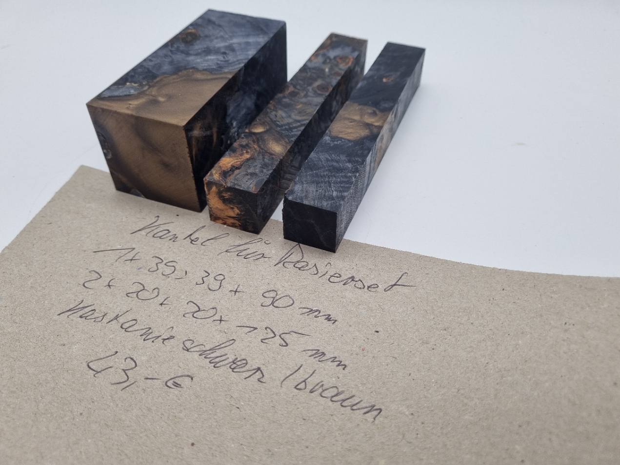 Rasierset 3tlg. Kastanie Hybrid schwarz/ braun. Dieses Set besteht aus 3 Kantel, deren Maße sind 1x 39mm x 39mm x 90mm und 2x 20mm x 20mm x 125mm.  Dieses Set passt genau für einen Pinsel, einen Rasierer und für den Ständer. Für die perfekte Oberfläche finden Sie auch hier bestes Material.  Beim Kauf erhalten Sie das abgebildete Set.